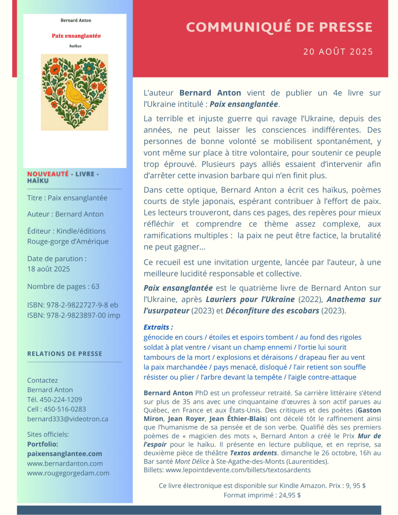 Bernard Anton, PhD est un professeur et un thérapeute retraité. Cet auteur humaniste vit dans les Laurentides (Québec). Il a publié plus d’une cinquantaine de livres : poésie, essai, roman, nouvelles, théâtre, matériel pédagogique. Plusieurs poètes et critiques (dont Gaston Miron, Jean Royer, Jean Éthier-Blais, Réginald Hamel…) ont salué très tôt la qualité de sa langue et son humanisme qui scrute les mouvements de l’âme. Il a créé le prix MUR DE L’ESPOIR pour le haïku et la maison d’édition ROUGE-GORGE D’AMÉRIQUE (contact : rouge-gorgedam@videotron.ca).